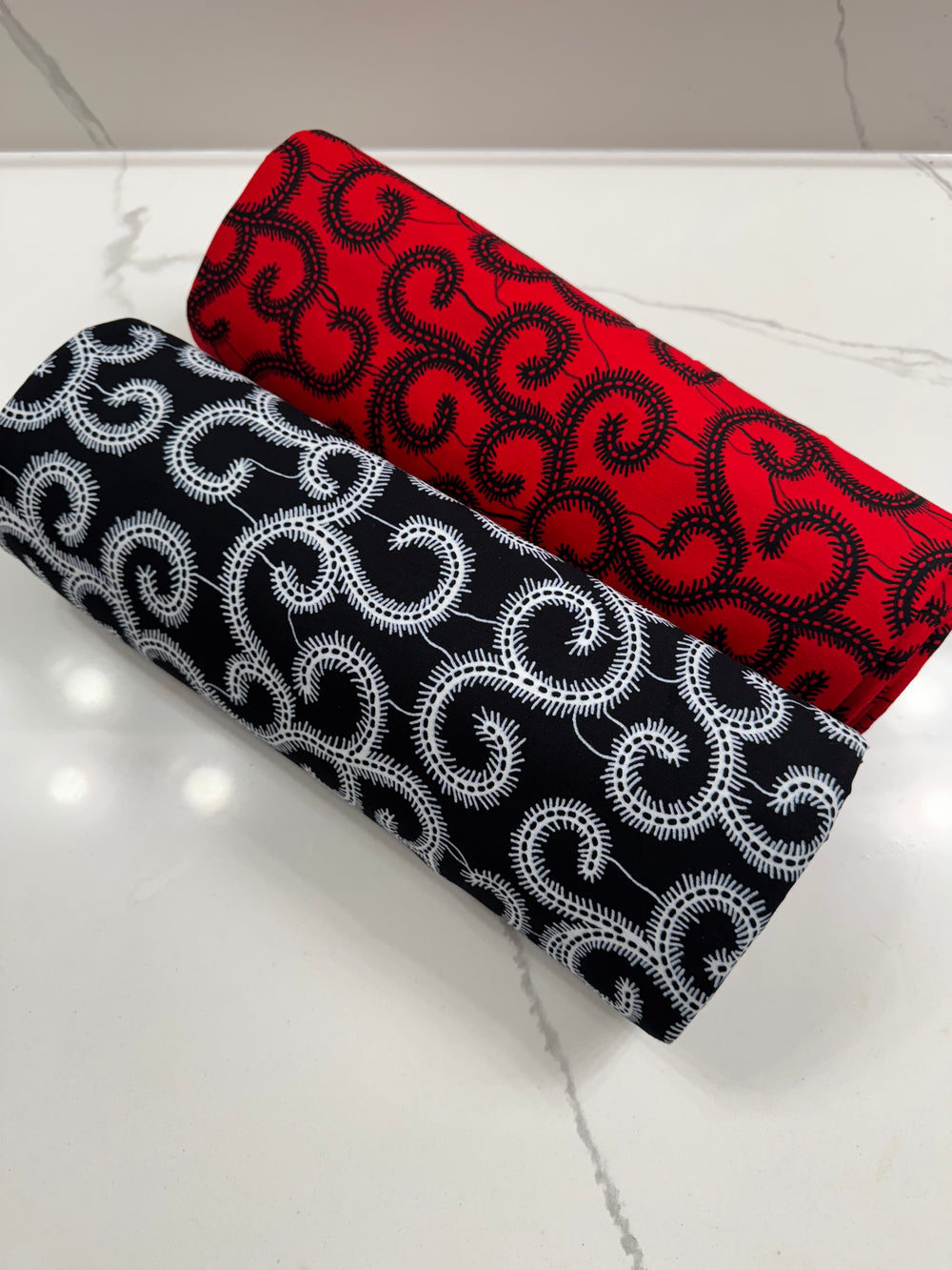 This gorgeous Red black mix and match combo is made of 2 complimenting fabric designs. You get 3 yards of each fabric for your beautiful formal or non formal outfits or for throw pillows or knitting/quilting. It will also be perfect for art and craft work